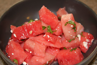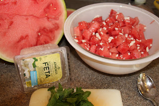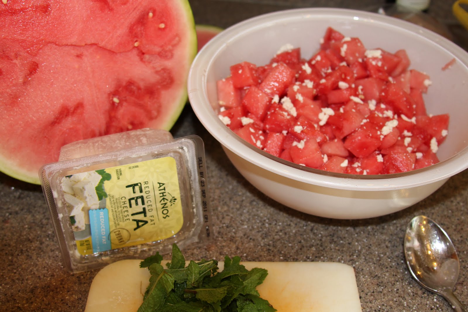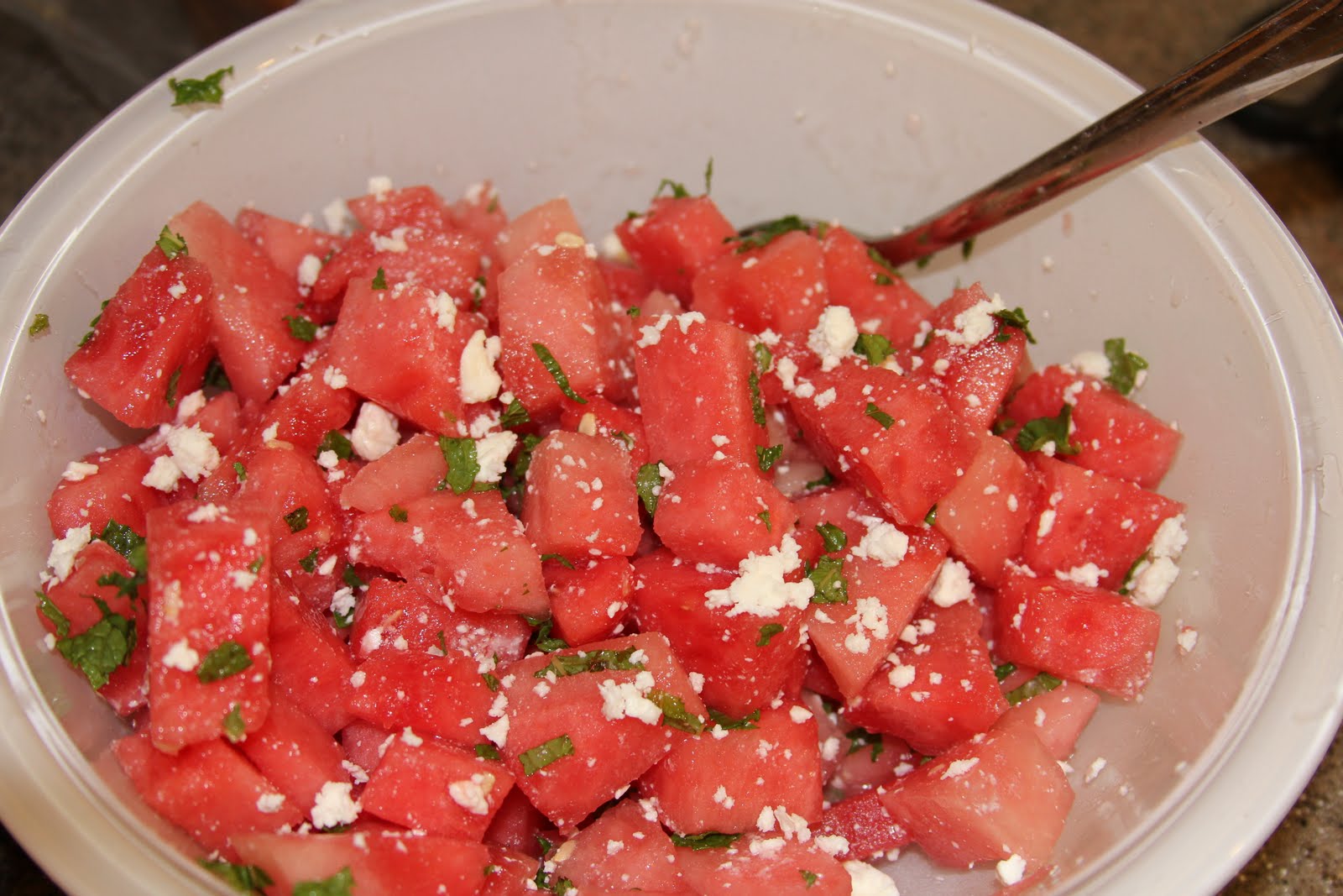 Drain watermelon juice from bowl, add Feta, Mint. Stir and Serve