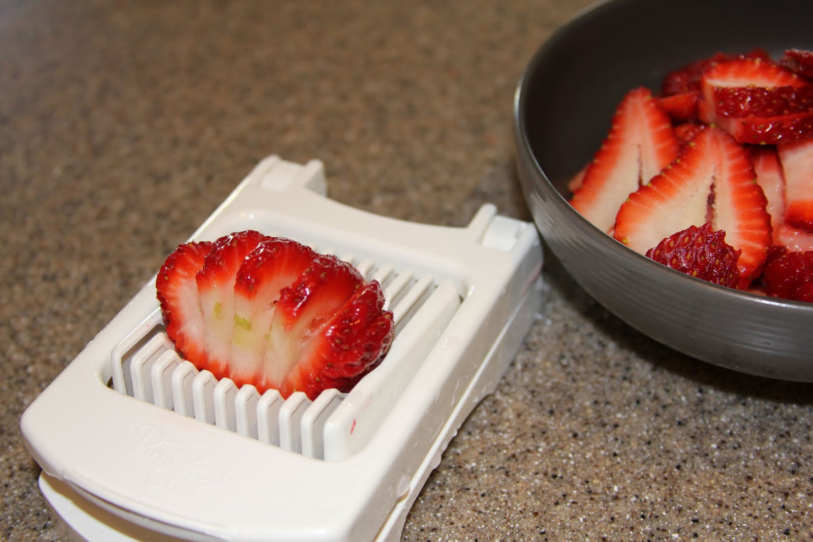 | Slice strawberries… an egg slicer works fabulously! |