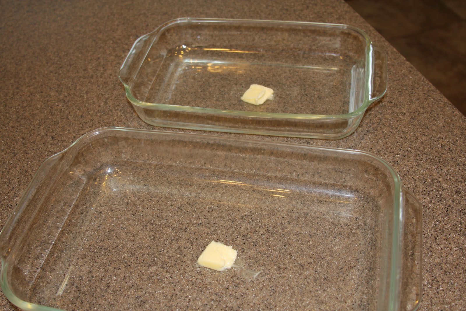 In glass 9×13 baking dish(es), put 1 tsp butter in each pan and melt in the oven for 1-2 minutes while it is preheating. Coat the pan with the melted butter. Pour batter evenly into pans. When oven reaches temperature,