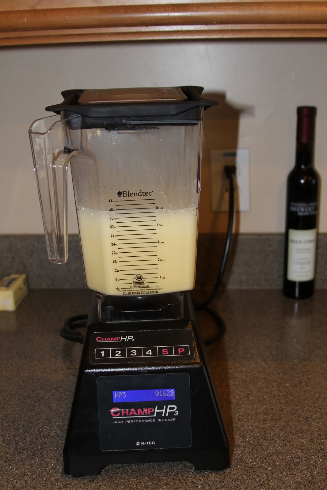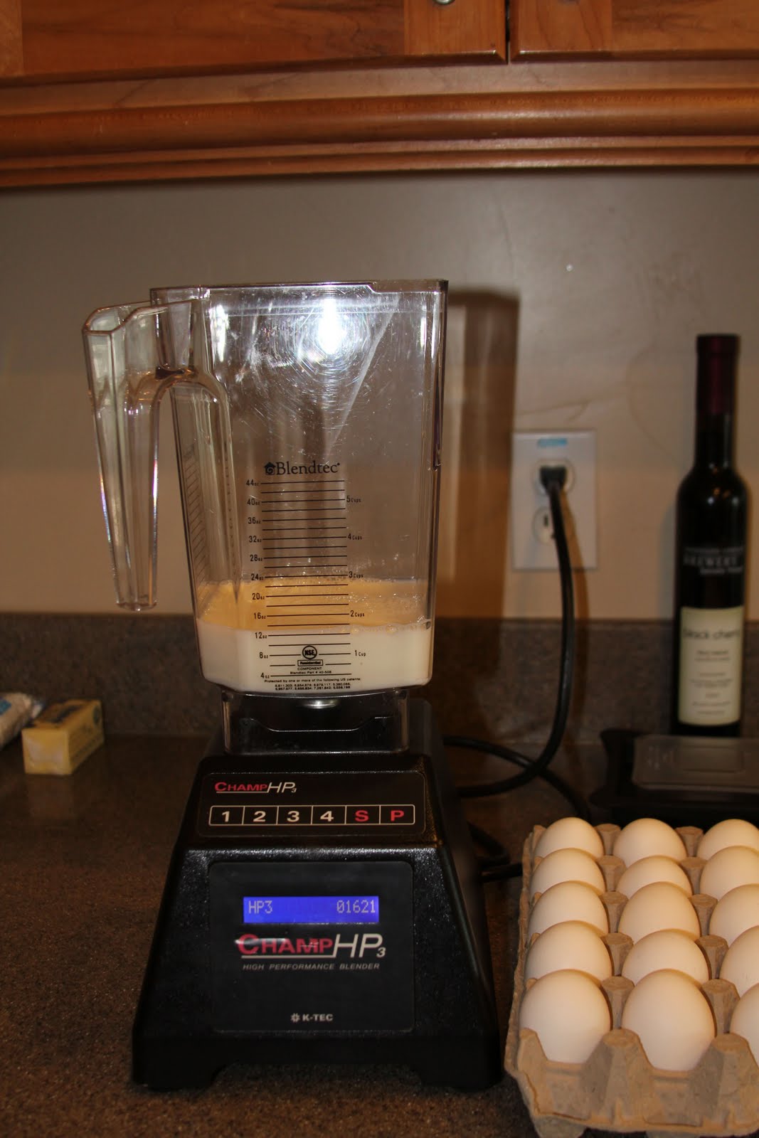 | Measure milk in blender, add eggs |