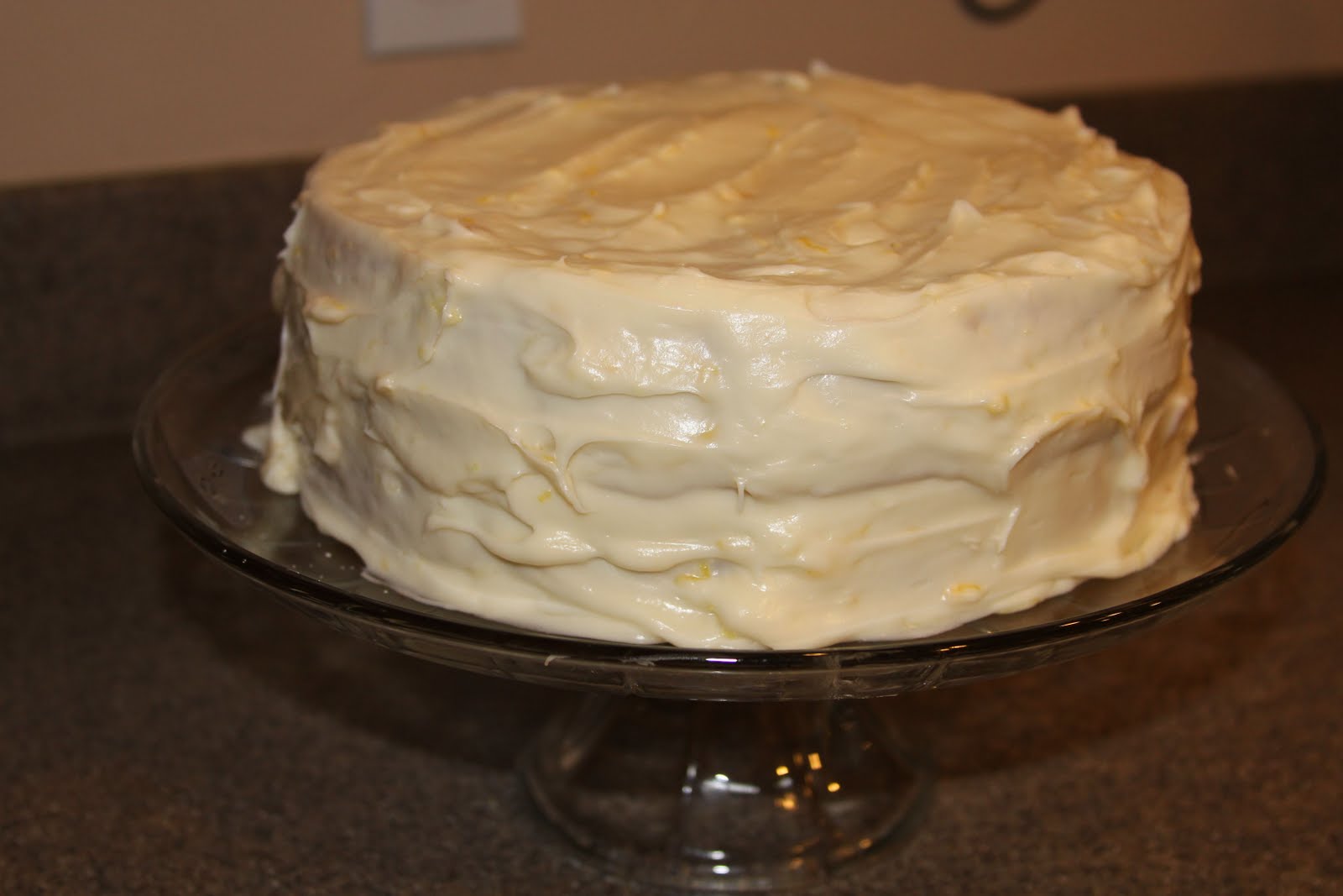 Cream the butter and cream cheese till smooth, add powder sugar, vanilla, lemon zest. Place one cake layer top side down on serving dish, spread with 1/3 the frosting. Place the other cake on top, face side down, frost the top and sides of cake.