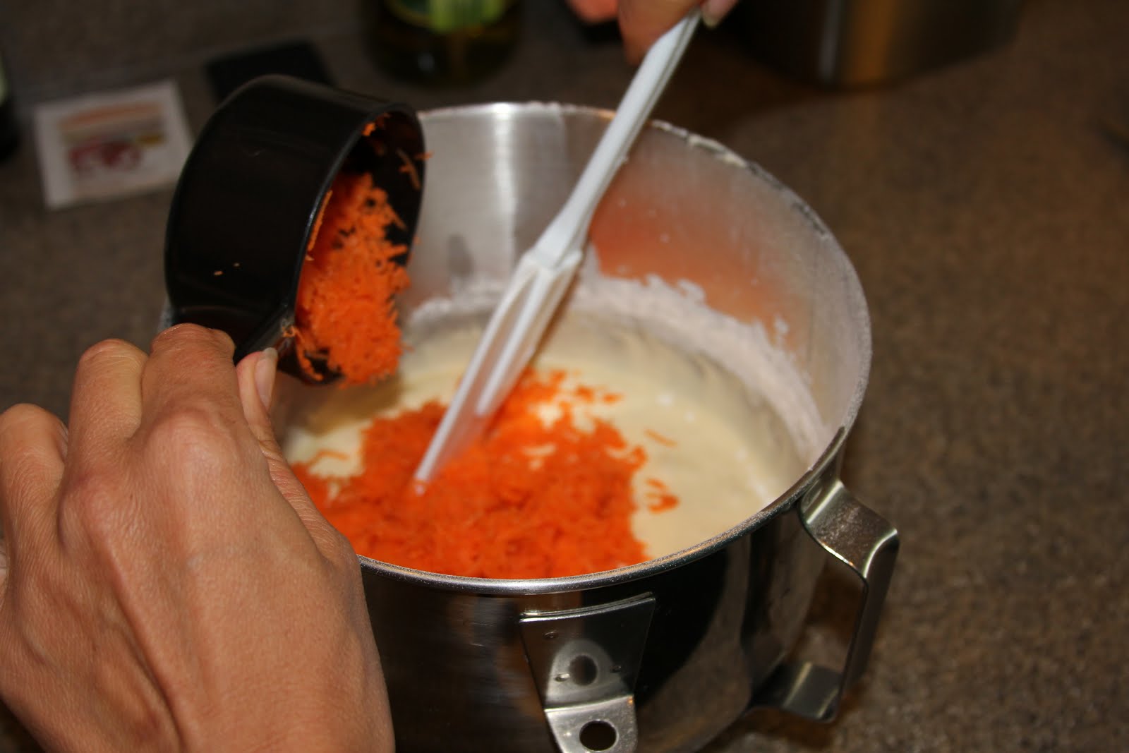Hand stir in carrots, raisins, nuts