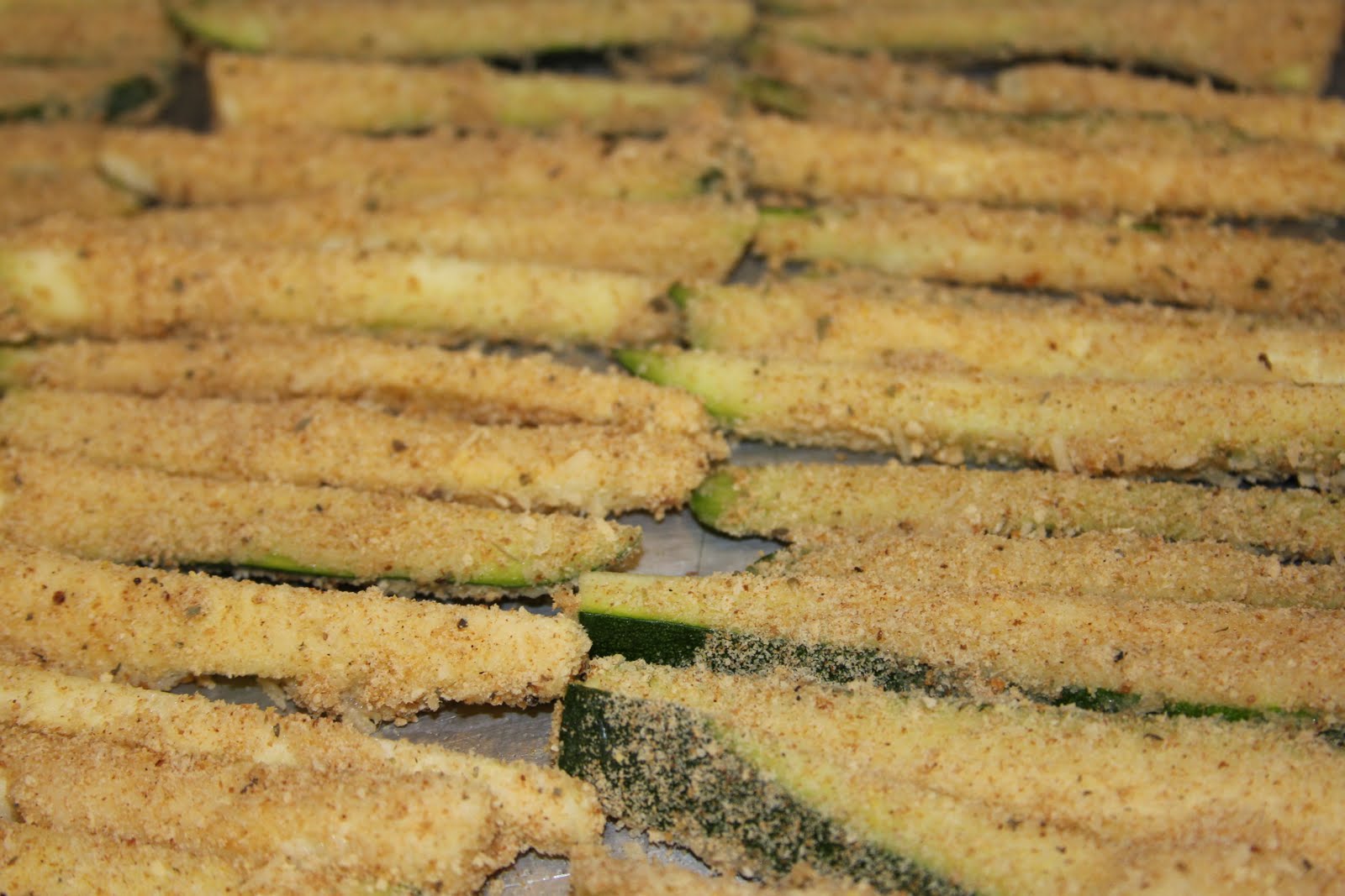 - Dip zucchini in egg whites, then dry mixture, and place on a sprayed cookie sheet