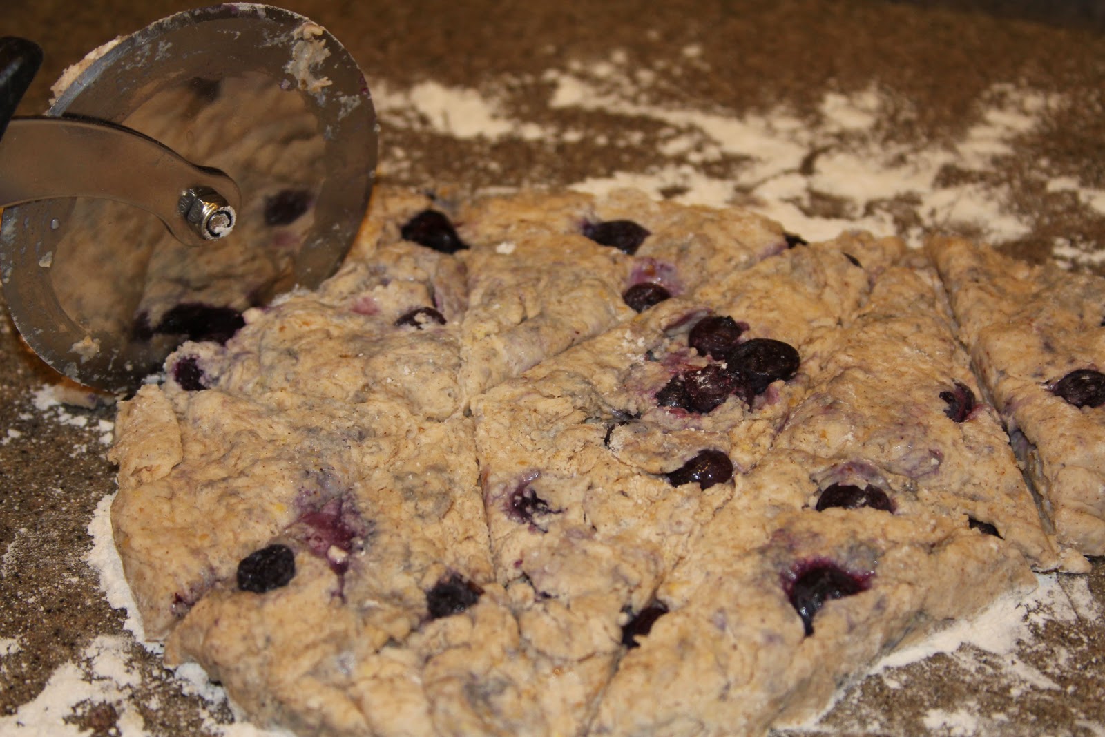 Flour dust surface, turn out dough, form into a 3/4 inch thick triangle. Cut into 12 small triangles with a large knife or pizza cutter. Place scones on parchment papered pan.