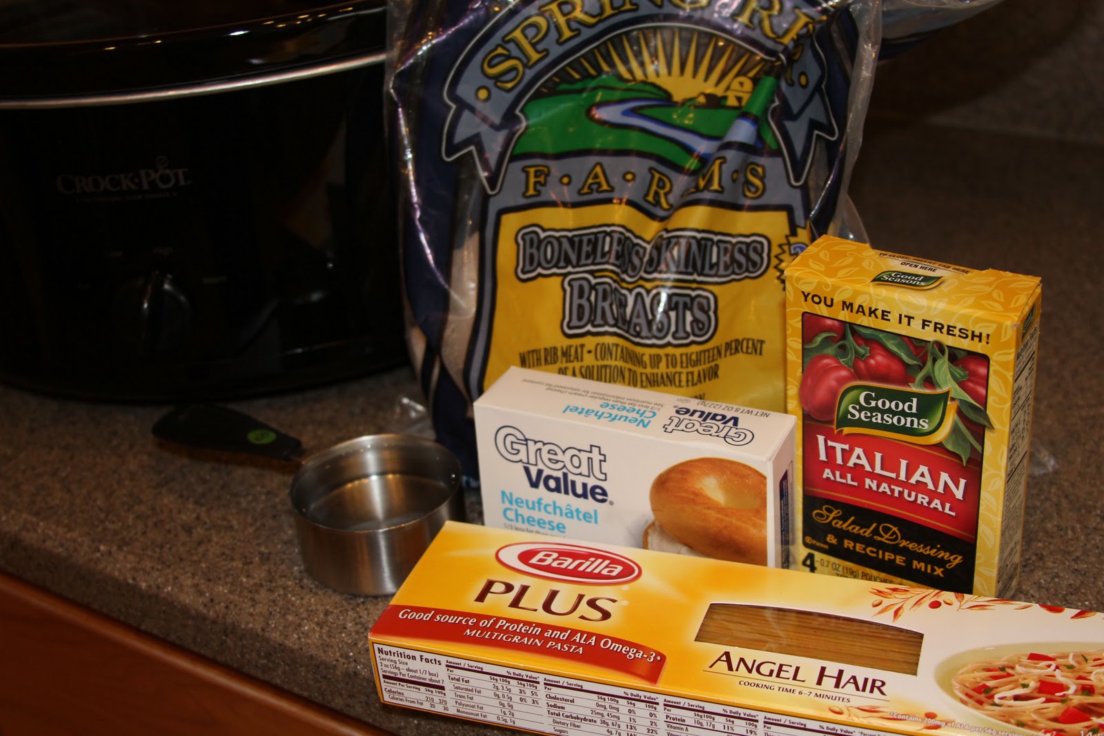 Place first 3 ingredients in Crockpot, cook on low 6 hrs, high for 3 hours. (Stir occasionally if you’re around) Remove 1/3 of the chicken to freeze and then 10 minutes before serving add the neufatel cream cheese to the Crockpot, melt in while cooking the noodles or rice. Stir in cream cheese and serve over noodles or rice.
