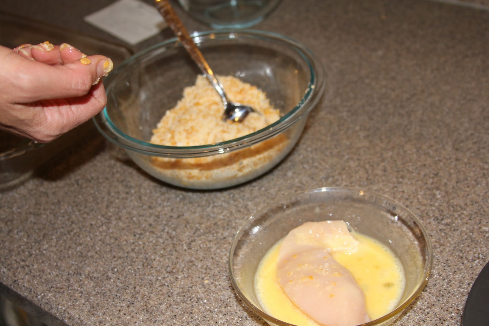 Dip chicken breast in egg and then dip in mixture.