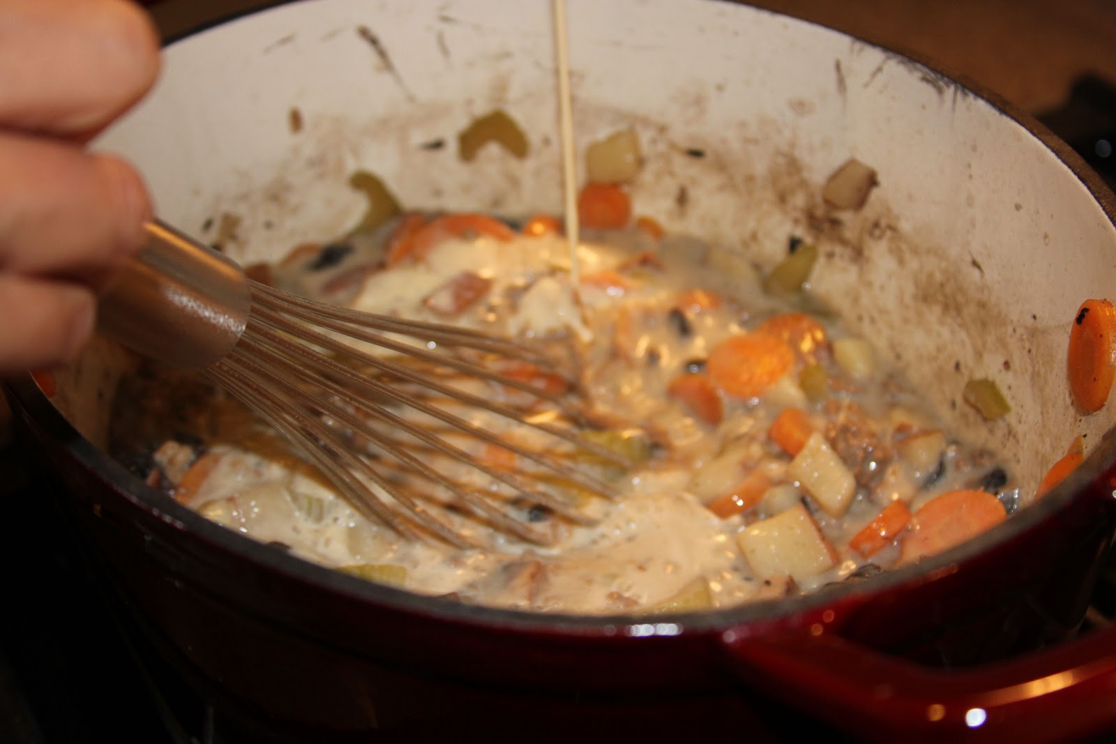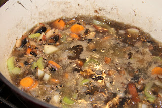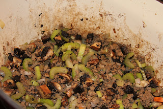 - In a dutch oven or large stock pot over medium heat combine beef, mushrooms, celery, onion. Cook until meat is browned.