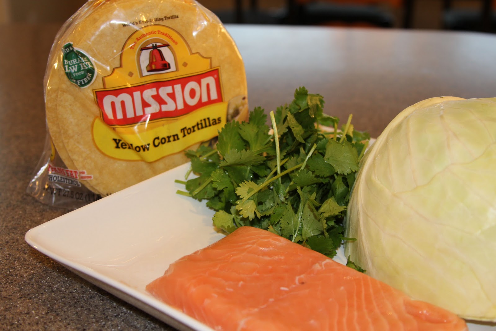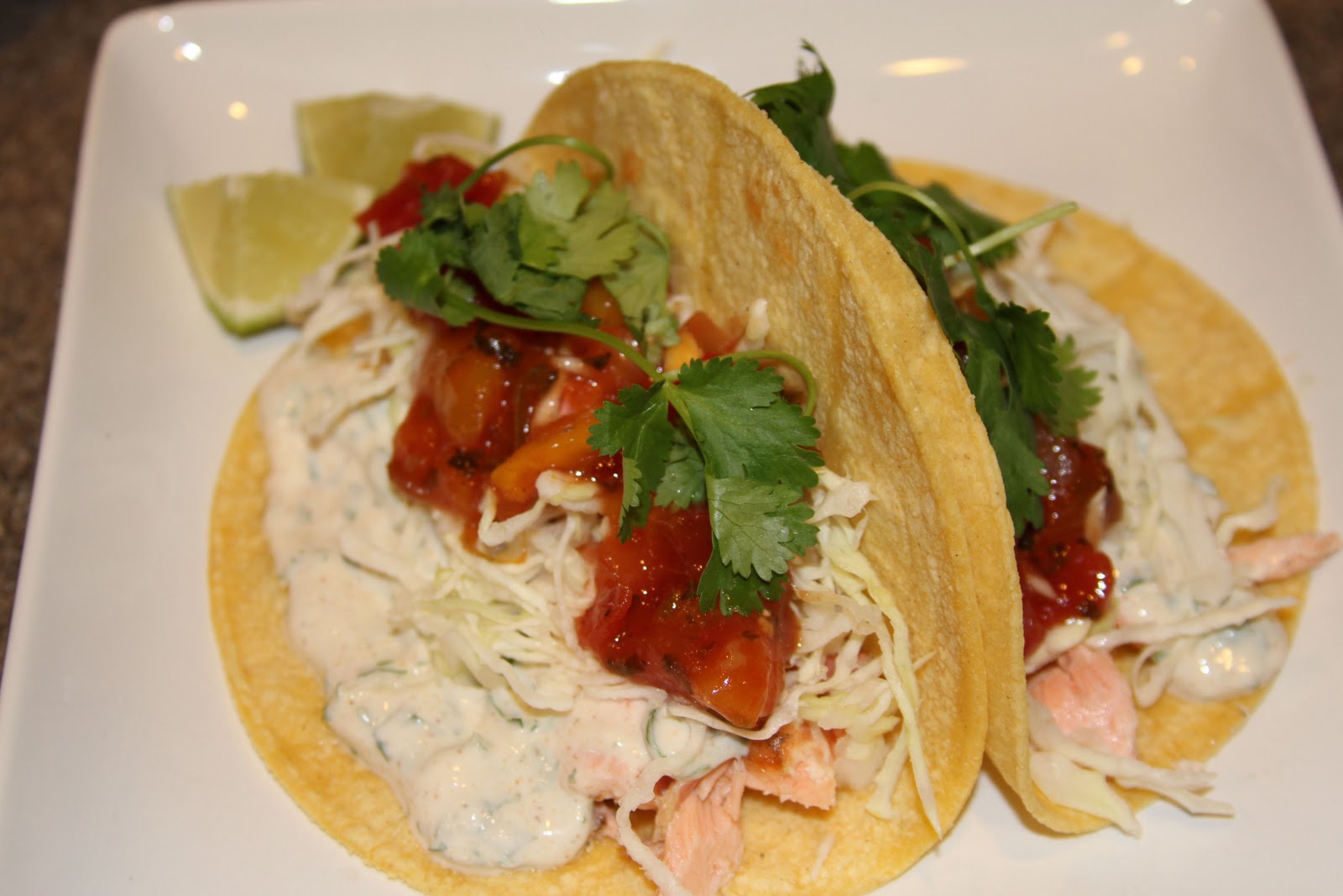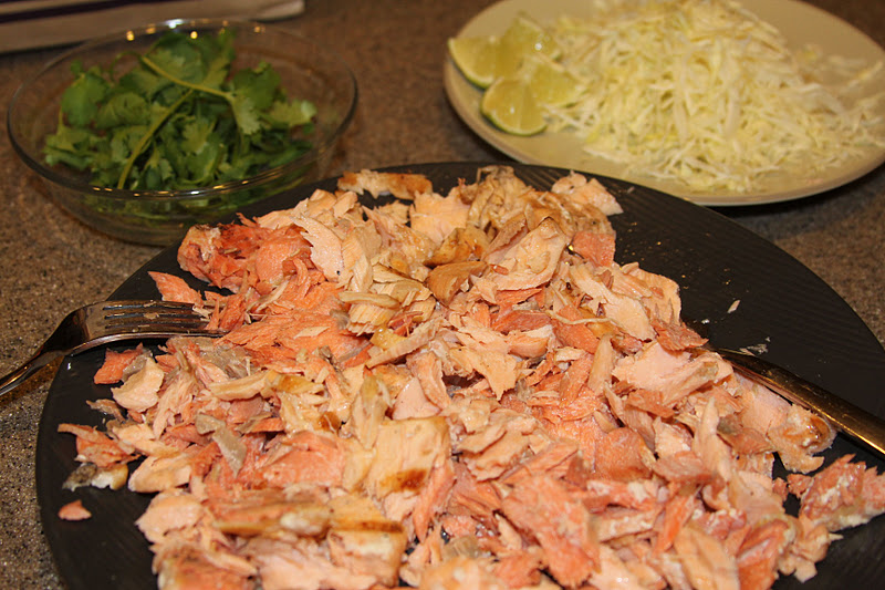 8-10 corn tortillas 2-3 salmon filets, grilled with fresh lime 1 C shredded green cabbage 2 sprigs of cilantro per taco (if you’re a cilantro lover) pico de gallo or any salsa 1 tbsp feta cheese (optional) Spray the filets with olive oil cooking spray on both sides and spray the grill well. Cook the filets on medium heat 3-4 minutes per side. Heat lime halves on the grill and squeeze fresh lime on while grilling. Salmon is done when pulls away flaky in the middle. Shred cabbage. Warm tortillas. Layer in toppings and top with the “SAUCE”