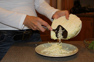 Shred the cabbage.. I use a cheese slicer to get nice thin, uniform shreds