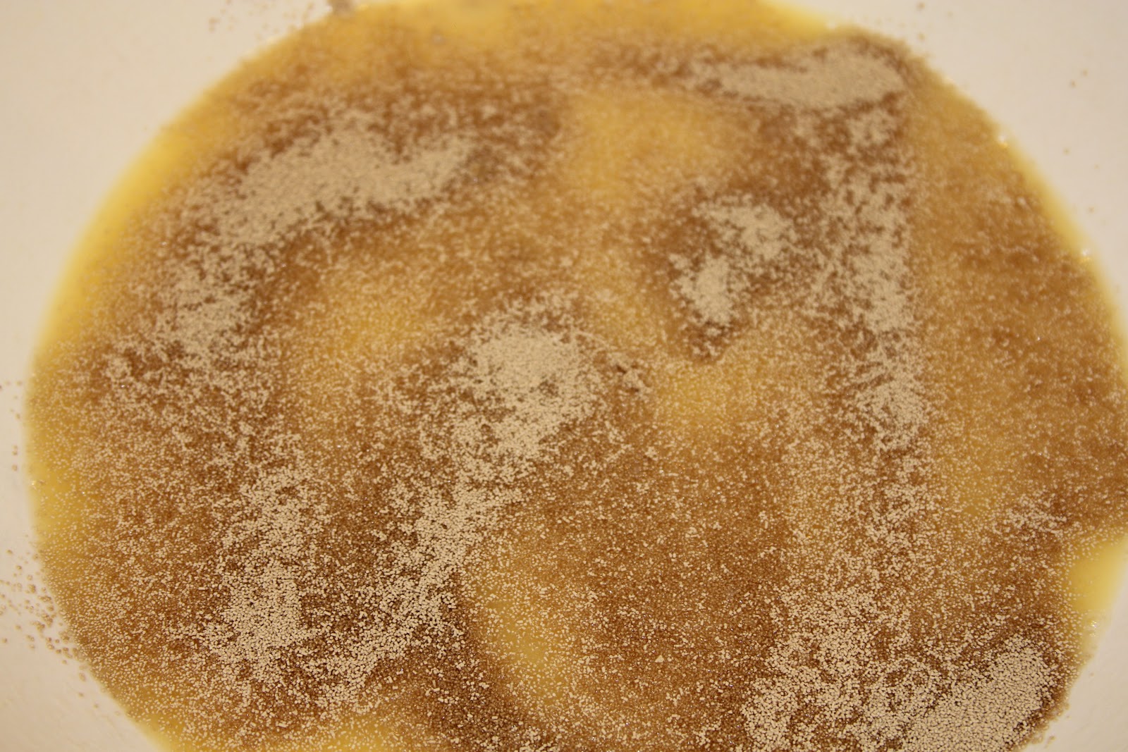 2. Pour into a large mixing bowl. Add honey. Sprinkle yeast on top.