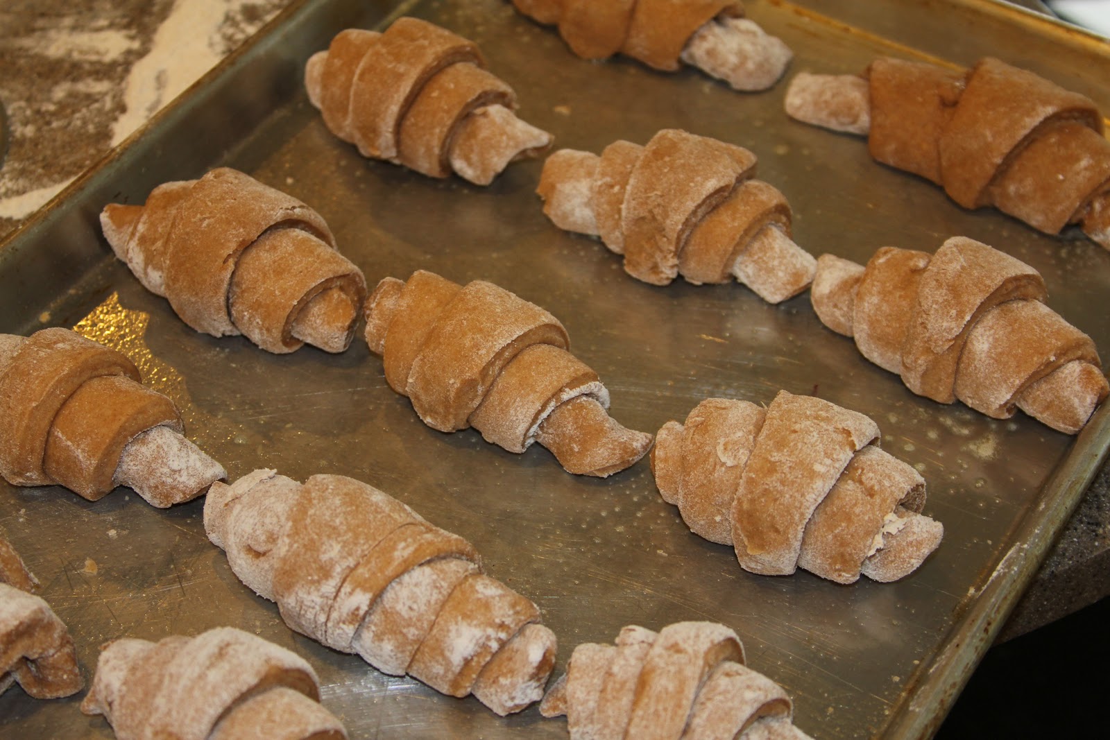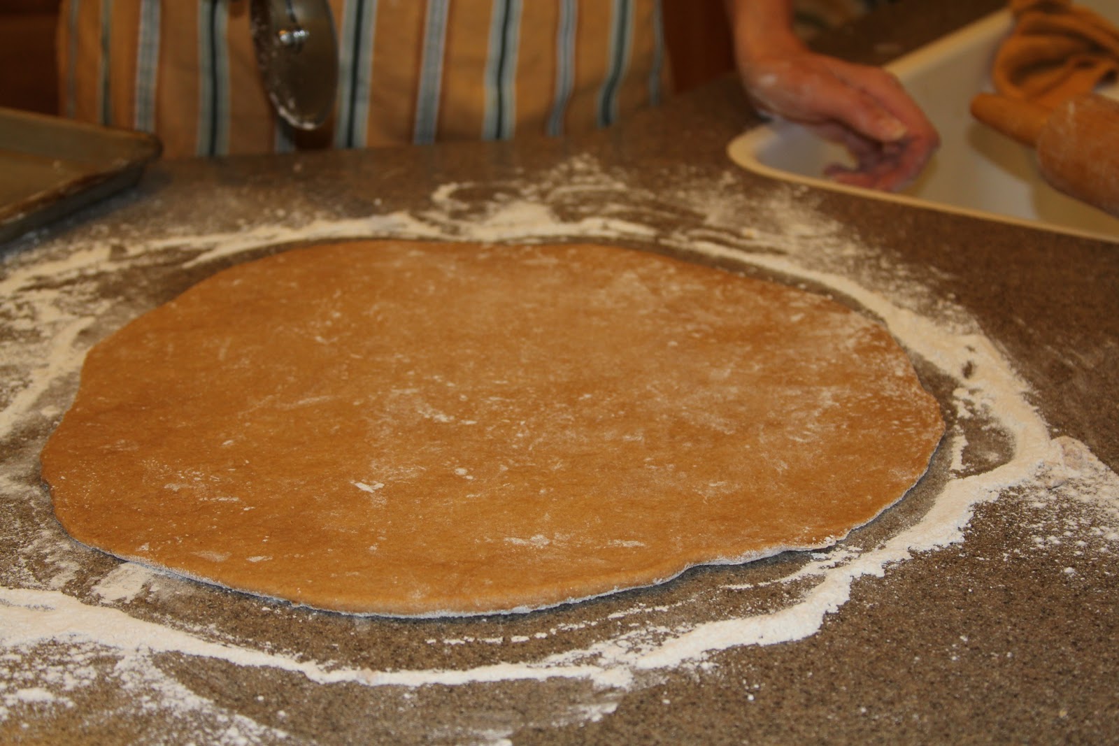 8. In the morning on a floured surface, roll out, 1/4 inch circle, cut into 12 wedges (like a pizza),
