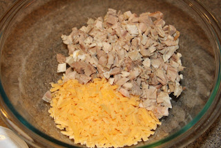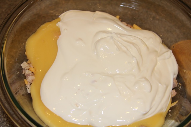 Combine diced turkey, cheese,