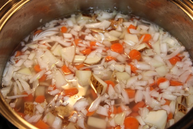 Chop veggies, cover with water, simmer until soft