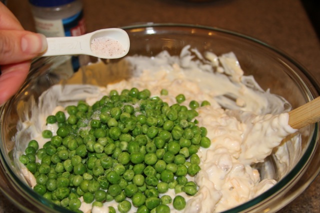 Add peas, salt, and pepper