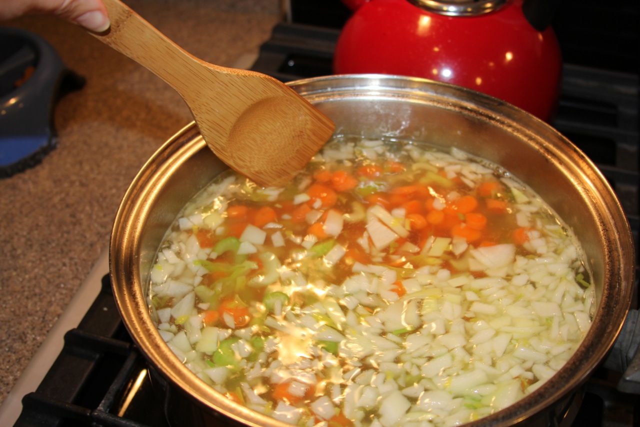 Chop veggies, add to water, bullion, spices, and garlic. Cover and simmer 10 minutes.