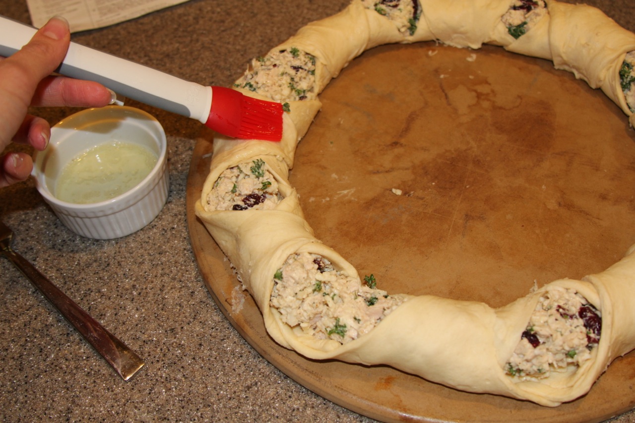 WOW! This Turkey Cranberry Wreath is photogenic!!  Really… it’s beautiful, easy, and delicious : )  You’ll be so proud of yourself.  It’s a Pampered Chef recipe, I love their cooking products and have tried a few recipes here and there.  This one is kinda high in fat but I used lowfat mayonnaise so that might  help a little??  Anyway,  Turkey Cranberry Wreathis a lovely Holiday dish that’d be fun for any party or get together…it’s also a great way to use leftover turkey and cooked chicken works too!  If you don’t have a pizza stone then I’m sure a pizza pan would work just fine…