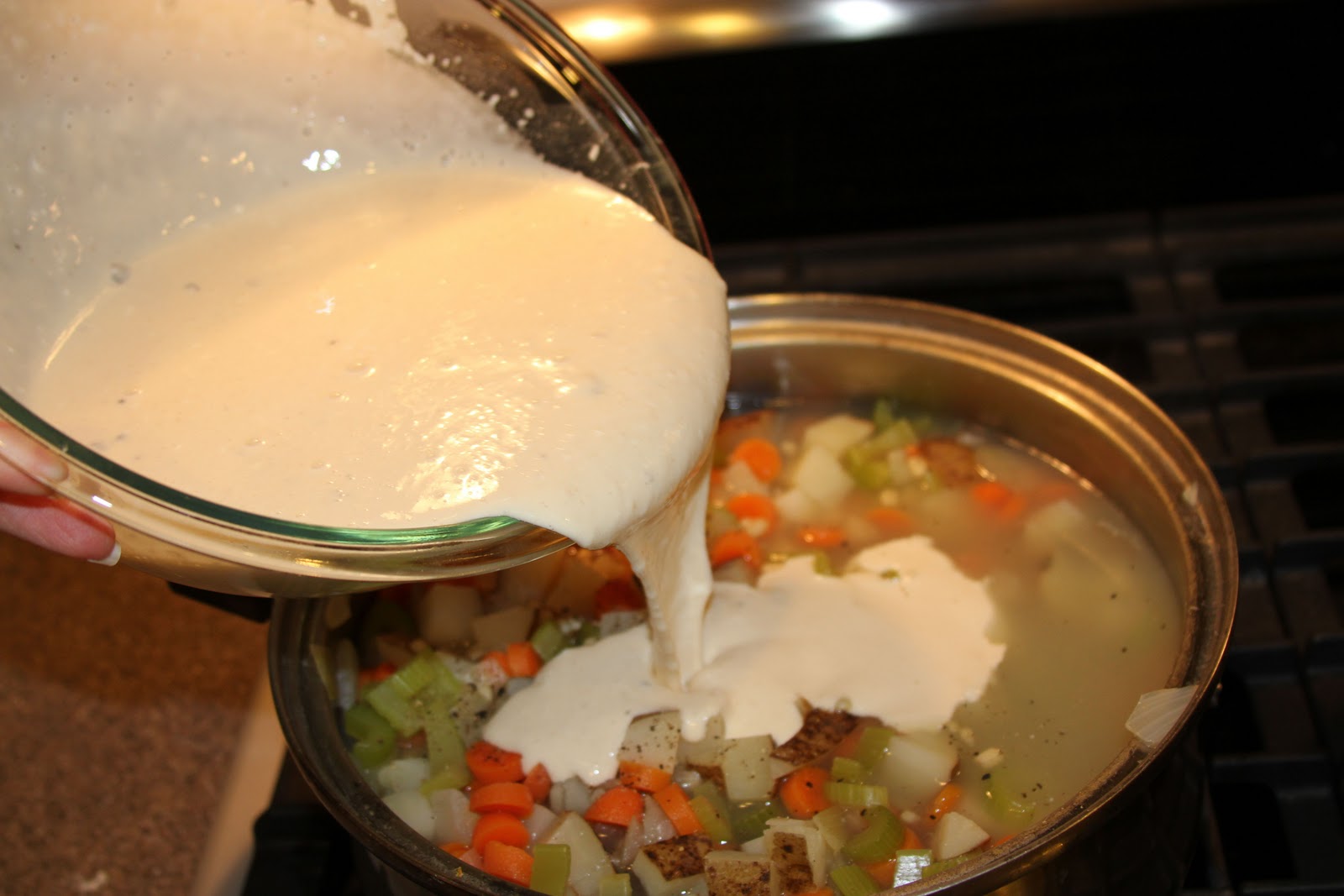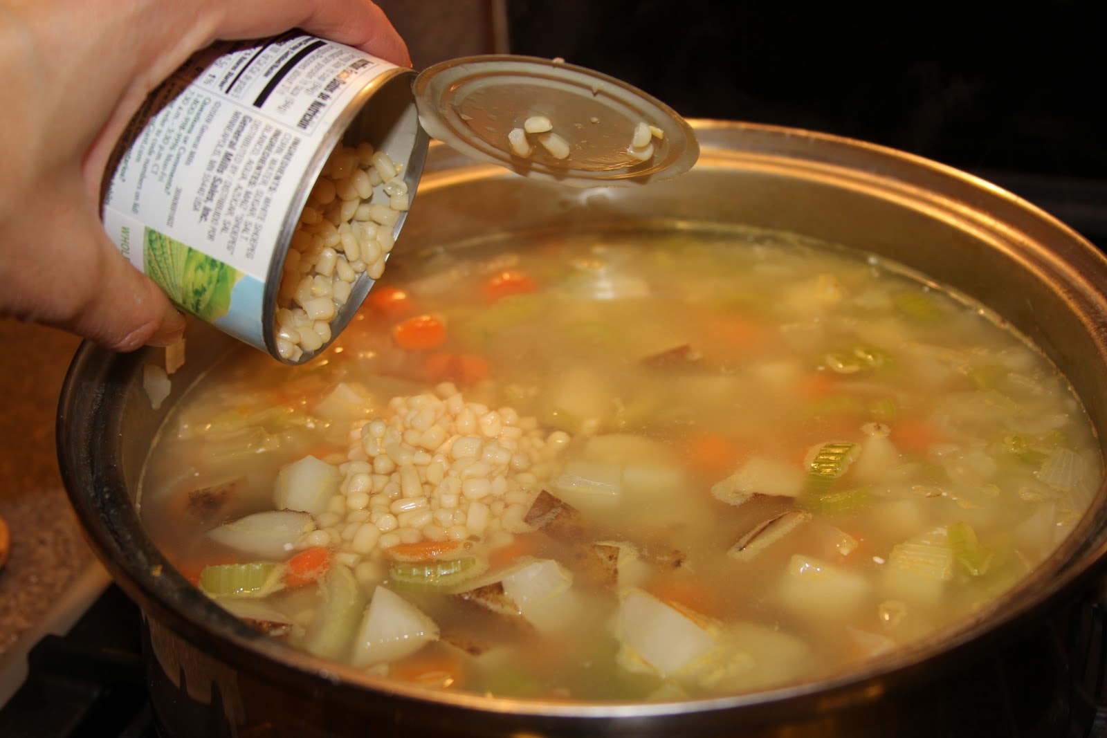 1. In a large stock pot combine first 4 ingredients, cover with water, boil 10 minutes or until veggies soften.