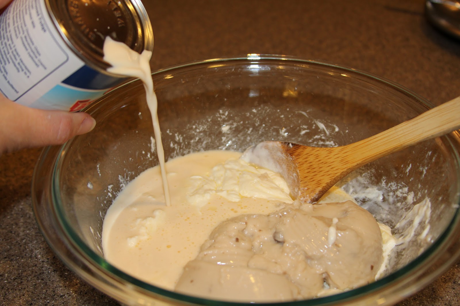 3. Add cream of mushroom soup, evaporated milk, microwave 1 minute, stir.