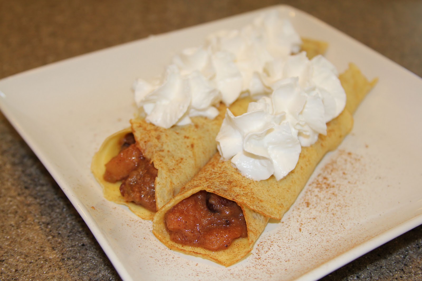 Place the Apple-Cranberry filling in the middle of the crepe and roll. Garnish with whip cream and cinnamon if desired