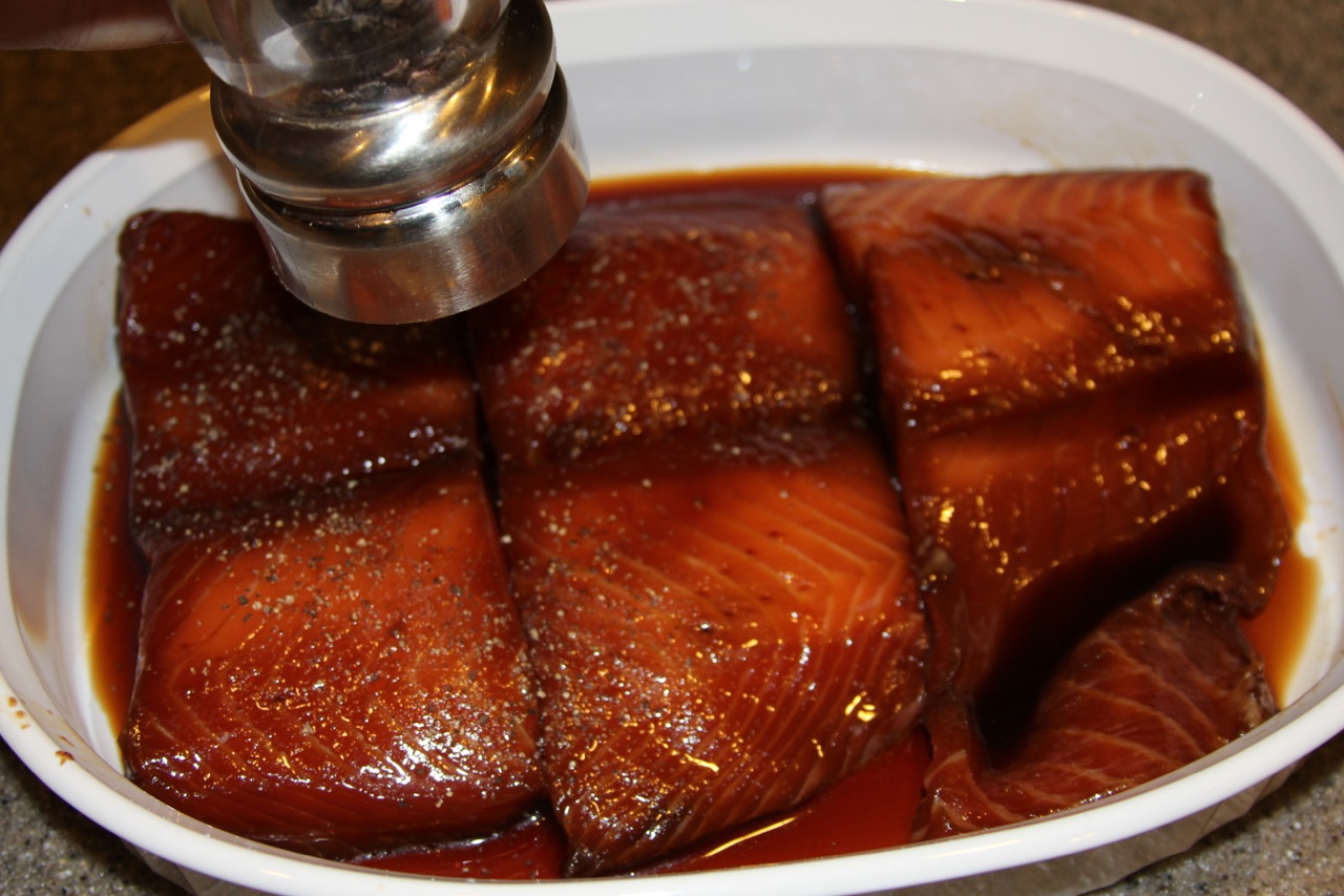 Preheat oven to 400 degrees.  Remove salmon from the marinade and place in baking dish.  Drizzle 2 Tbls of marinade over the salmon, discard remaining.  Grind pepper over the salmon (add as much as you prefer).  Cover with foil, reduce heat to 350 degrees, and bake 15-20 minutes until pulls away flaky in the center of filet. Uncover the last 5 minutes if desired.