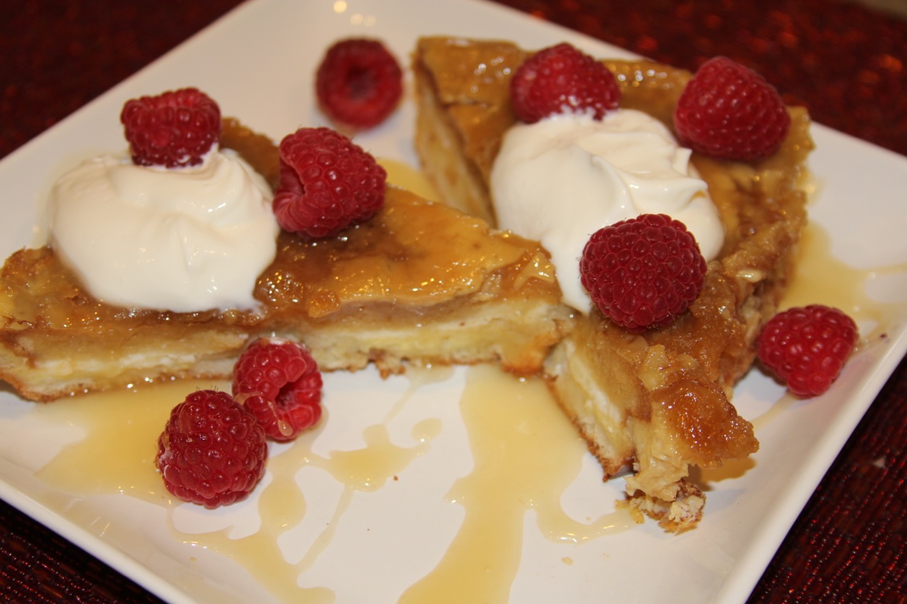 Serve caramel side up with Butter Syrup, sour cream, and berries |