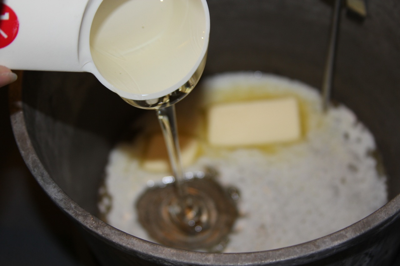 Have a cube of soft butter handy for handling. In a heavy bottom stock pot, melt butter, add karo.