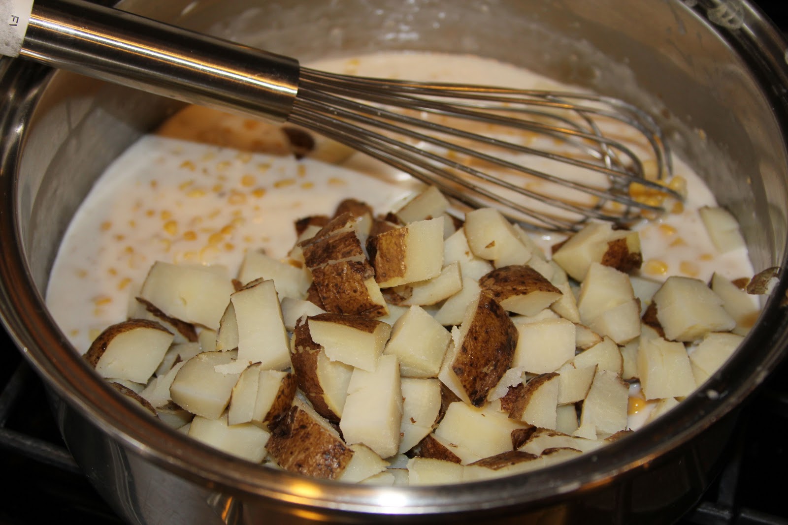 4 baked potatoes, diced (or dice 4 potatoes, cover with water, cook until tender soft, drain)