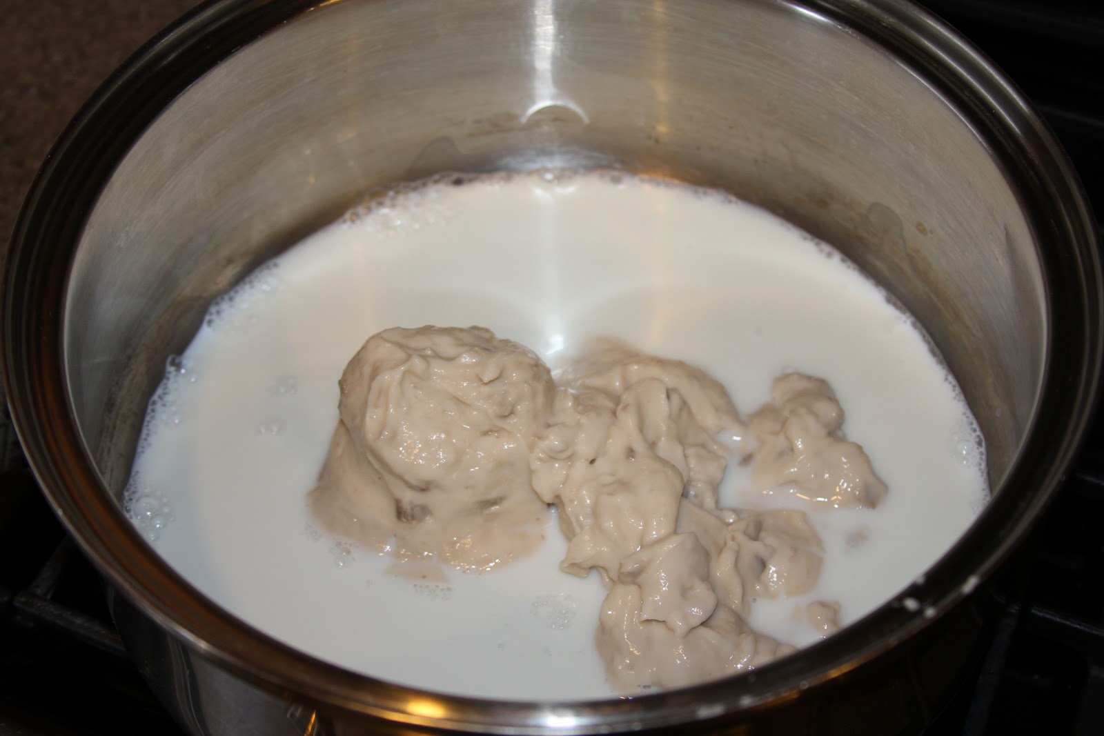 1. In a stock pot warm the milk and cream of mushroom soup.