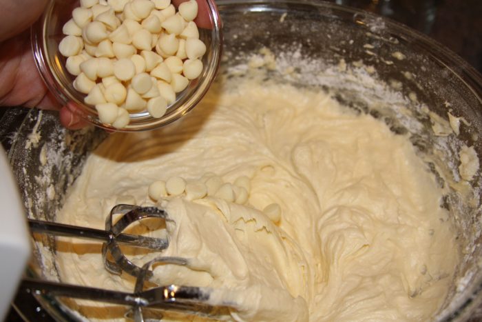 3. Using a hand mixer cream butter in a bowl, add sugar, 1 C flour, baking powder, salt mixing well. Add eggs and vanilla, mix well. Add scant 1/2 C remaining flour, mix well. Add white chocolate chips. Divide evenly between paper liners.