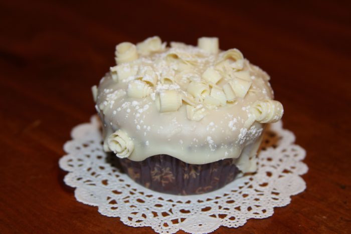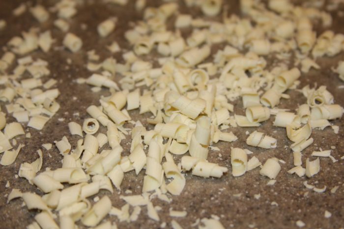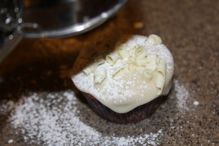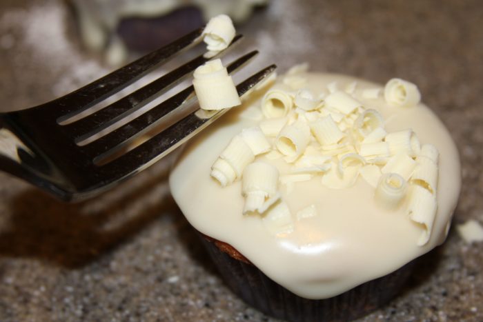 5. Using a peeler create curls with the white chocolate bar onto a piece of wax paper. If chocolate is not curling well then microwave for 3-4 seconds, do not over heat. Once cupcakes are cooled, frost, and place chocolate curls on warm cupcakes using a fork, dust with powdered sugar, let frosting cool. Frosting will drip down the sides