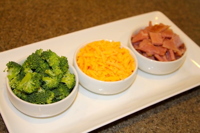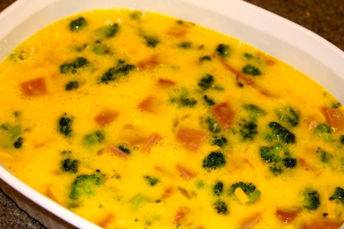 - Beat eggs, add ham, broccoli, cheese and stir.