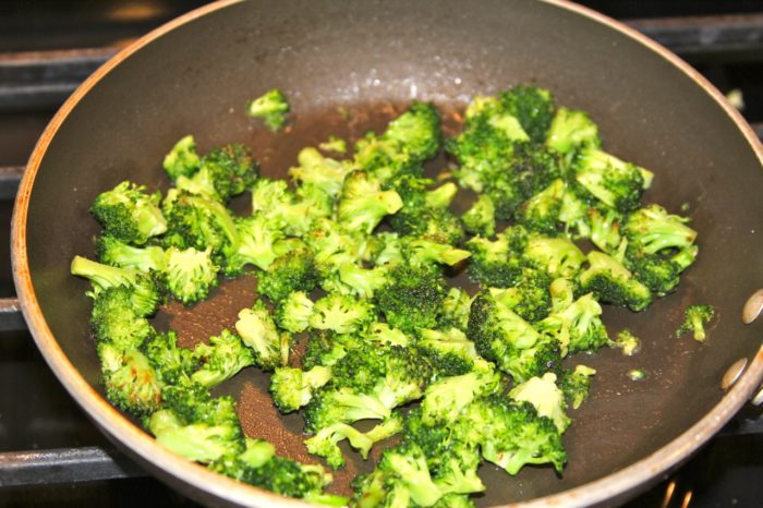 - In a sprayed fry pan cook broccoli for 2-3 minutes to soften.