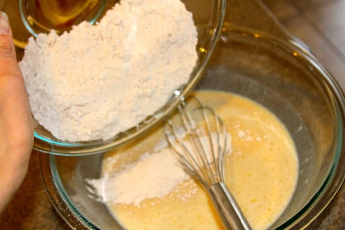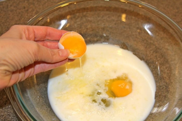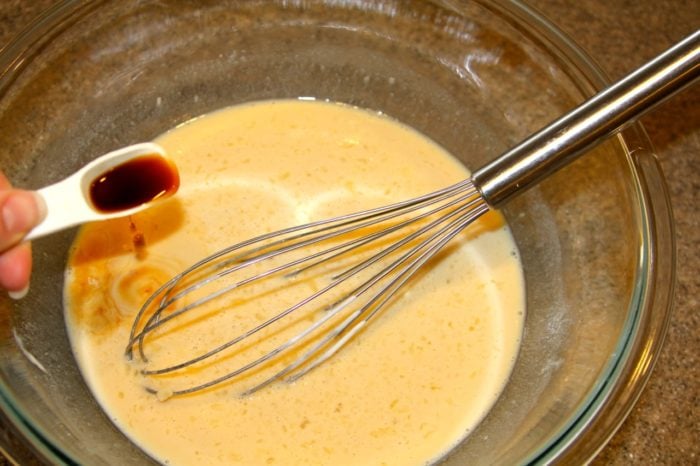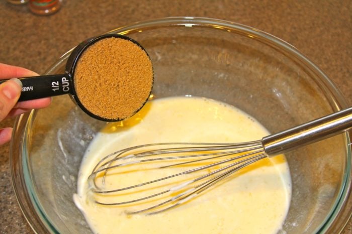 2. Whisk eggs, milk, brown sugar, sour cream, butter, vanilla in another bowl.