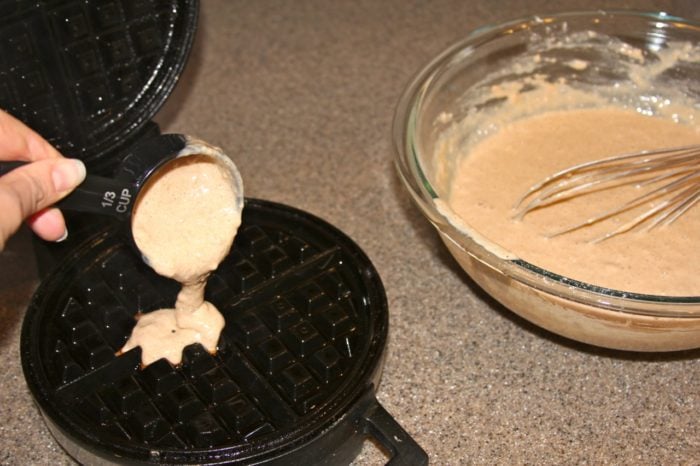 - Bake in a hot waffle iron according to manufacter’s instructions