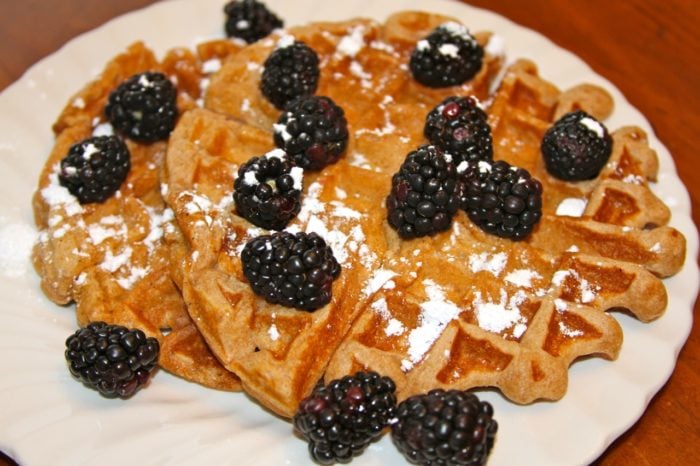 Spiced Sour Cream Waffles are just lovely for a Sunday morning brunch…  which is a MUST DO around our house!  Nothing like a lazy Sunday morning with a nice late Brunch to refuel the family for the up coming week!!   These waffles are made with 1/2 whole wheat flour and 1/2 white flour, low fat sour cream, and just a titch of butter.  The combination is wonderful… with just the right amount of spice 🙂  Give these  Spiced Sour Cream Waffles a try today!