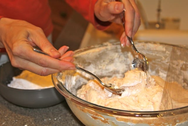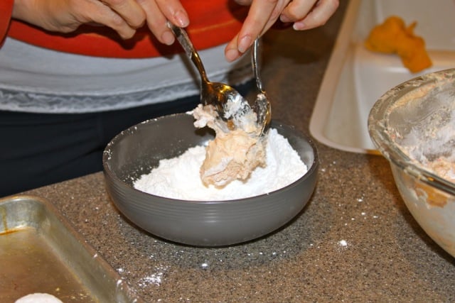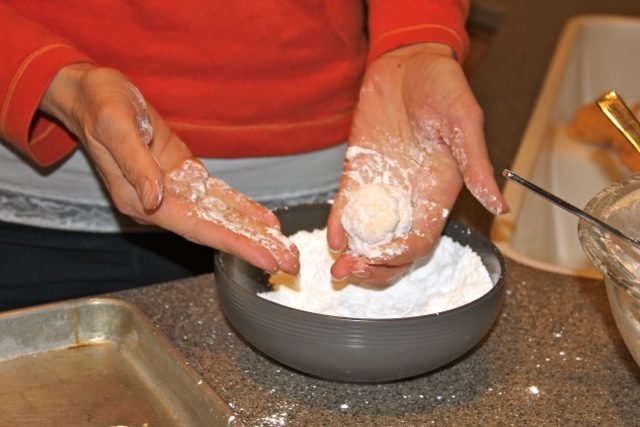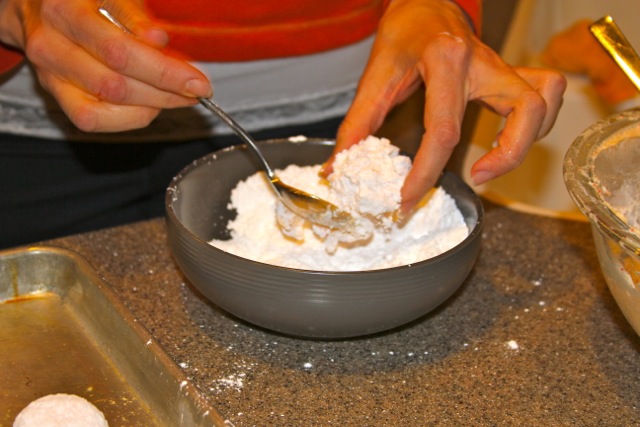 - Drop by Tablespoonfuls into powdered sugar; coat thoroughly and roll into balls with hands.