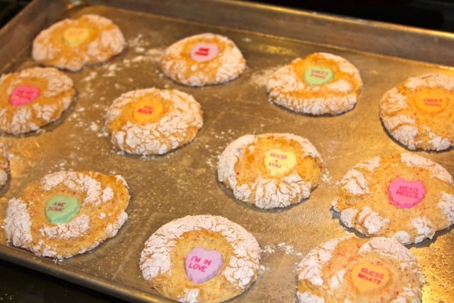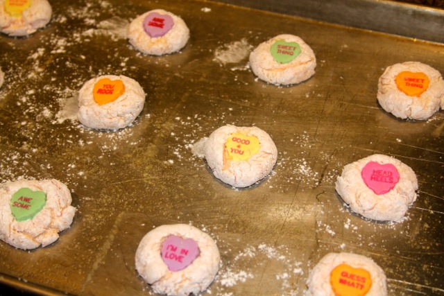 - Place on sprayed cookie sheet, press conversation heart into the center of each cookie