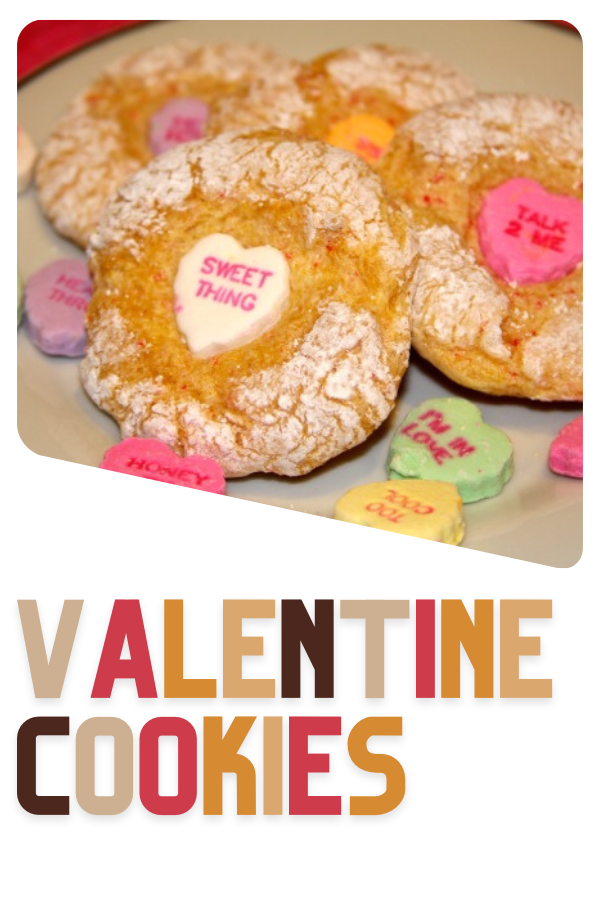 Chill dough for at least an hour. Drop by Tablespoonfuls into powdered sugar; coat thoroughly and roll into balls with hands. Place on sprayed cookie sheet. Press one conversation heart candy into each cookie. Bake at 375 degrees for 9-10 minutes just until lightly browned. Cool on cookie sheet for 4-5 minutes until set enough to transfer to rack. Freeze well. Yields: 60