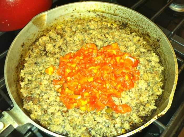 - Wipe out pan with paper towels, add sausage back to pan, add Rotel tomatoes