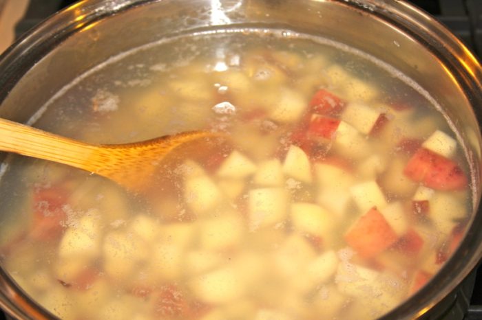 - In a lare stock pot over medium heat chop potatoes and cover with water