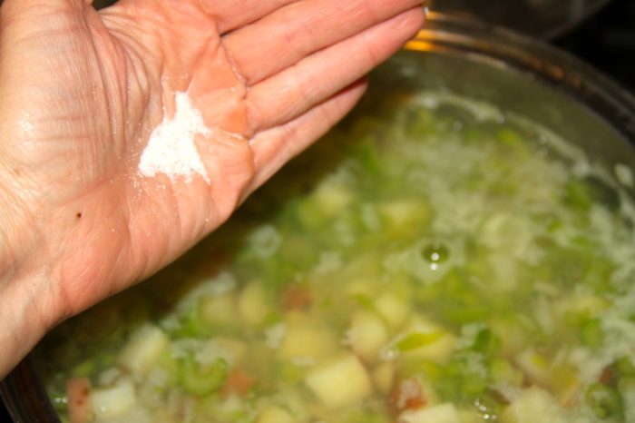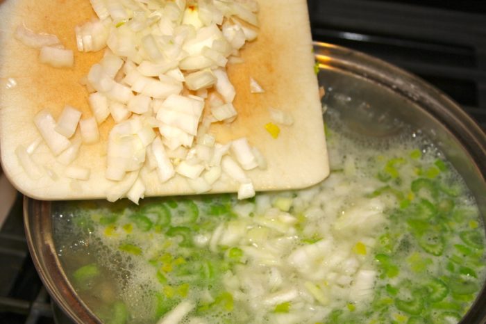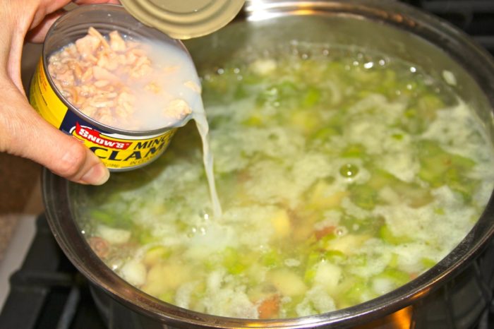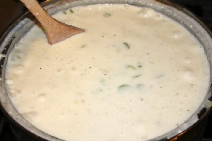 - When vegetables are done (leave remaining water), add white sauce to pot, add clams with juice, salt, and pepper.