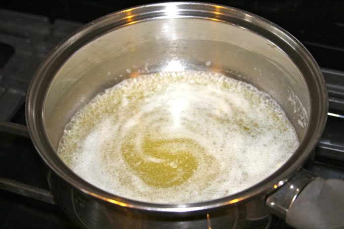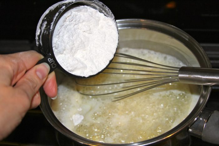 - Slowly add flour and whisk in to make a rue, let cook for 1 minutes, stirring