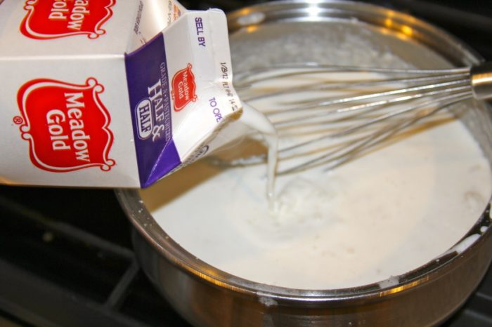 - Slowly add half and half, whisking in with each addition to avoid lumps