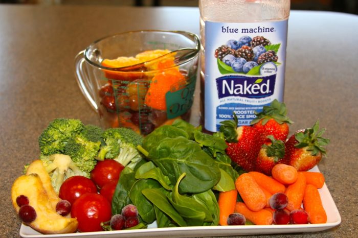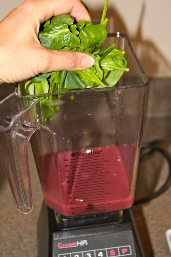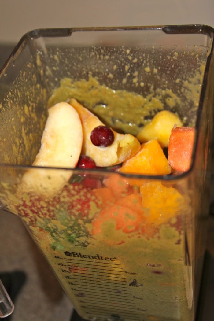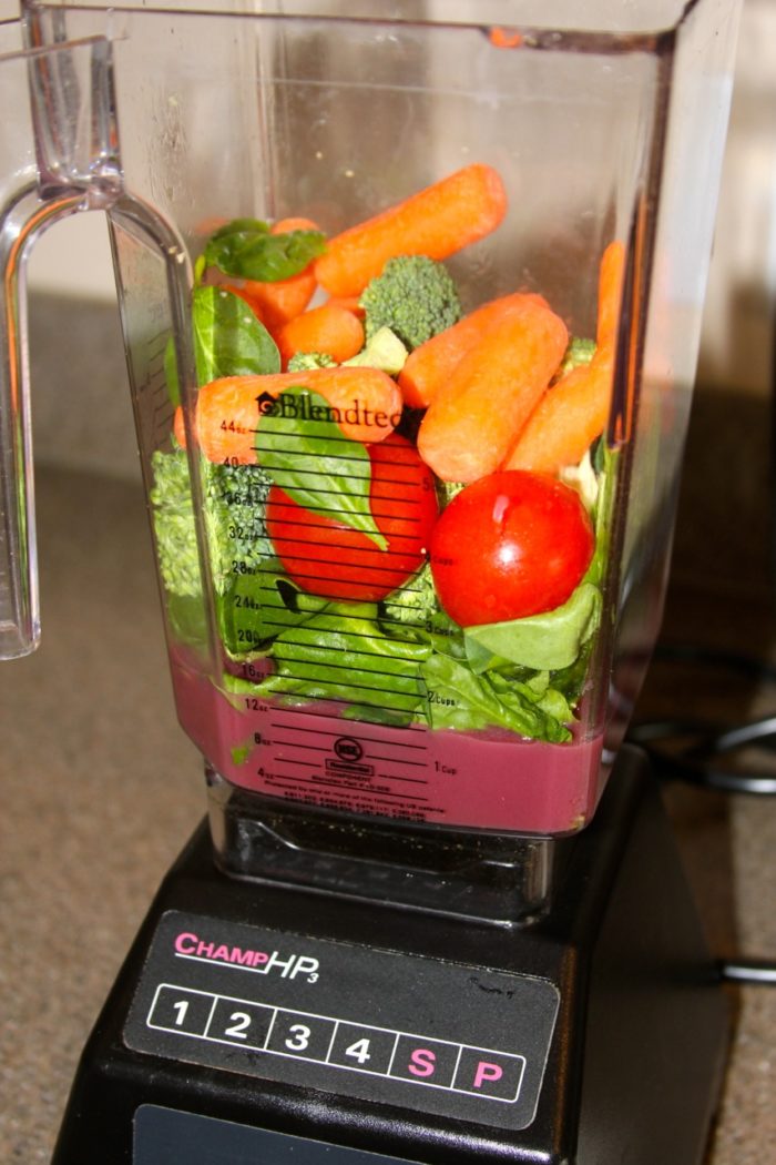 - Blend juice and veggies until smooth. Add fruit and blend until smooth. Serve!