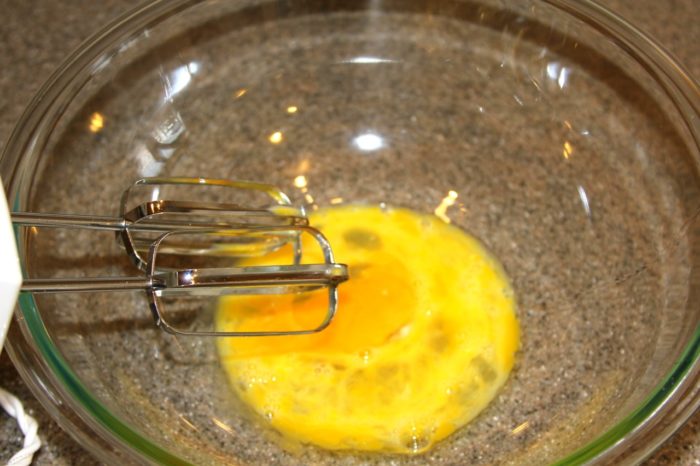 - In a large mixing bowl beat the eggs