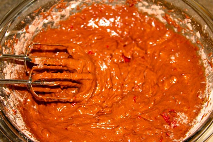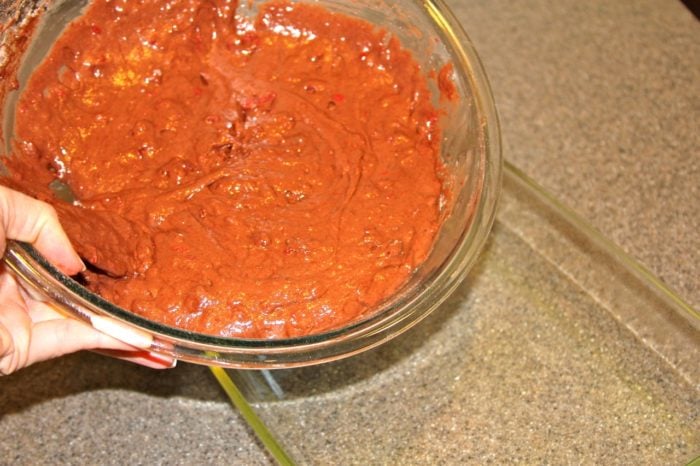 - Scrape sides of bowl and pour into pan, smooth out