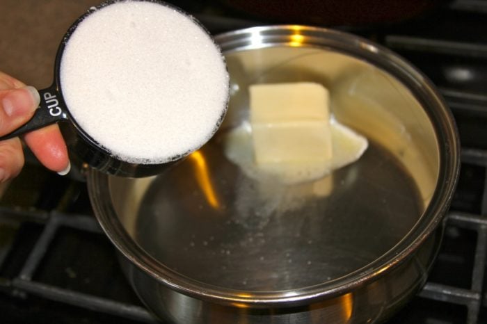 - In a small sauce pan melt butter and add sugar
