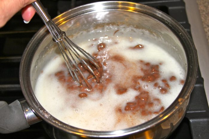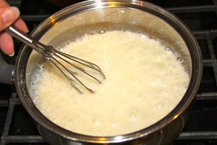 - Add milk stirring continually over medium low heat until comes to a boil