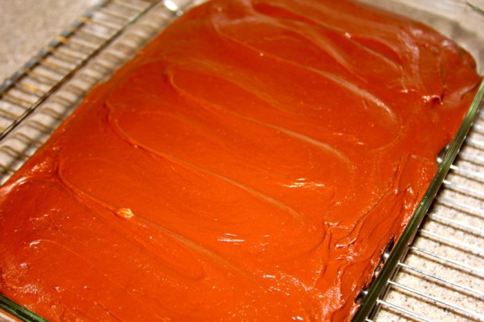 - Pour onto warm cake and spread evenly