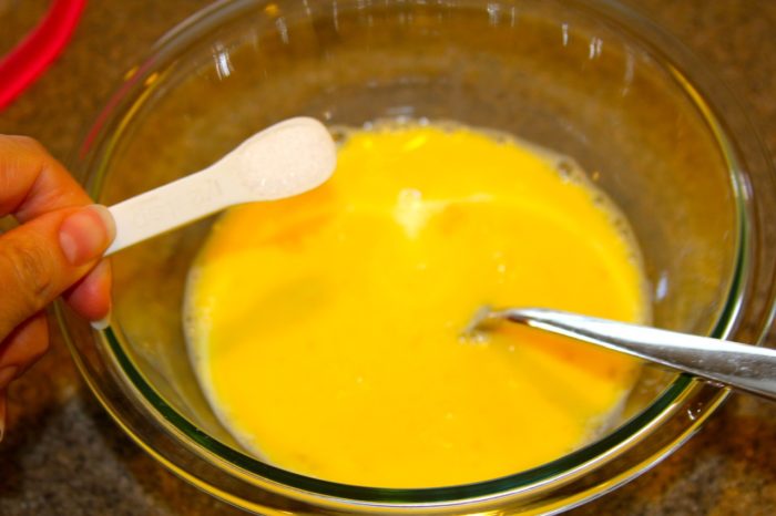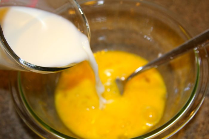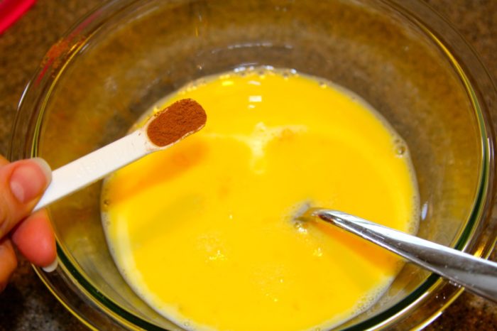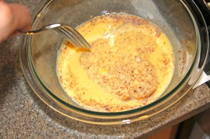 - Dip each side of the bread into the egg mixture (beat the egg mixture before dipping each slice)